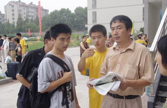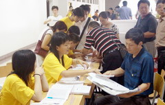 志愿者給家長送來茶水 | ![]() 志愿者給家長指示路線 |