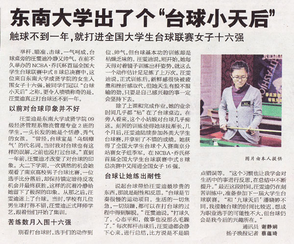 舉桿、瞄準(zhǔn)、擊球,一氣呵成,臺(tái)球桌旁的汪雯迪冷靜又帥氣。在前不久舉辦的NCBA·喬氏杯首屆全國(guó)大學(xué)生臺(tái)球聯(lián)賽中式8球總決賽中,這位來(lái)自東南大學(xué)成賢學(xué)院的女生入圍女子十六強(qiáng),被同學(xué)們冠以“臺(tái)球小天后”之稱。更令人嘖嘖稱奇的是,汪雯迪真正打臺(tái)球還不到一年。