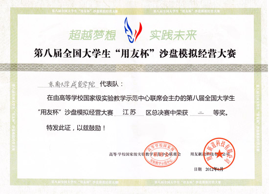 2012全國第八屆大學生“用友杯”沙盤大賽獲獎證書