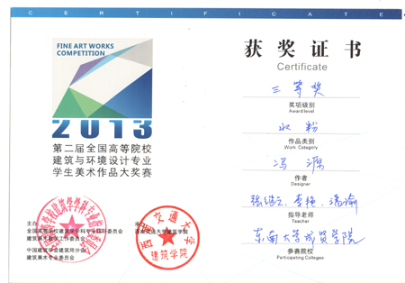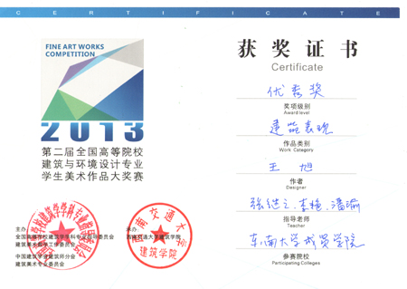 我院建筑與藝術(shù)系學(xué)生在2013年第二屆全國高等院校建筑與環(huán)境設(shè)計專業(yè)學(xué)生美術(shù)作品大賽中獲得佳績。其中,2010級藝術(shù)設(shè)計1班馮源的水粉作品和2009級藝術(shù)設(shè)計2班薛華的速寫作品獲得三等獎,陳穎潔、王旭、馮源等3名學(xué)生的建筑表現(xiàn)、水粉系列作品獲得了優(yōu)秀獎。建筑與藝術(shù)系張繼之、李艷、潘瑜3位老師獲得了優(yōu)秀指導(dǎo)教師獎。