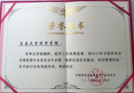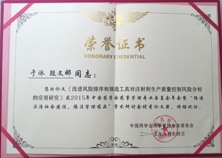 榮譽證書 2015年8月13日,中國藥學會藥事管理專業(yè)委員會學術(shù)年會在海南海口市隆重舉行。我院藥事管理專業(yè)于泳老師帶領(lǐng)學生,向?qū)W術(shù)年會投稿7篇,均被年會交流論文集收載,其中稿件《改進風險排序和篩選工具對注射劑生產(chǎn)質(zhì)量控制風險分析的應用研究》獲得藥事管理專業(yè)委員會的優(yōu)秀論文獎。我院特別榮獲“優(yōu)秀組織獎”。