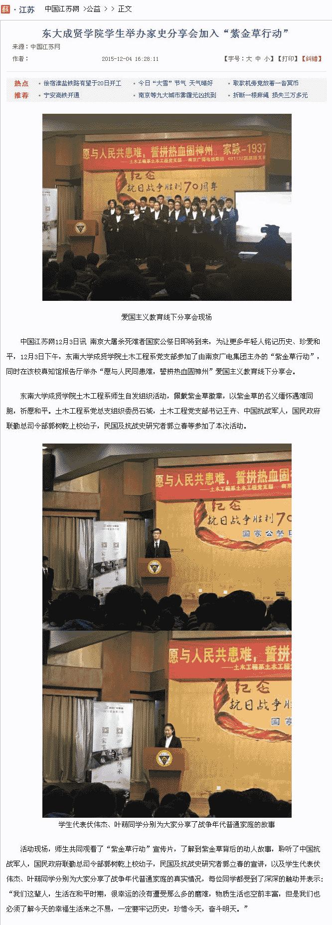 【中國江蘇網(wǎng)】東大成賢學院學生舉辦家史分享會加入“紫金草行動”