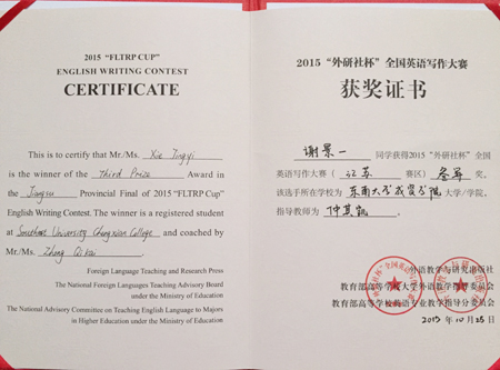 在英語寫作大賽江蘇賽區(qū)決賽中,我院2015級電子信息1班的謝景一同學(指導教師:仲其凱)獲江蘇賽區(qū)三等獎,2014級電子信息1班的張德嵐同學(指導教師:嚴艷)和2015級會計1班的支音同學(指導教師:仲其凱)獲江蘇賽區(qū)優(yōu)勝獎。