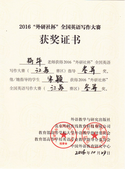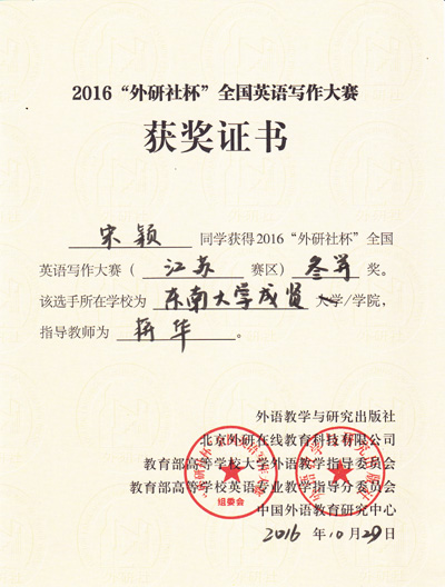 2016年“外研社杯”全國(guó)英語(yǔ)寫作大賽江蘇省賽區(qū)復(fù)賽于10月29日在南京林業(yè)大學(xué)圓滿落下帷幕。我校基礎(chǔ)部英語(yǔ)教師燕如萍指導(dǎo)的2015級(jí)電子信息專業(yè)謝景一同學(xué)在本次比賽中榮獲江蘇省一等獎(jiǎng),這是目前我校在省級(jí)英語(yǔ)比賽中獲得的最好成績(jī)。此外,由基礎(chǔ)部蔣華老師指導(dǎo)的2015級(jí)會(huì)計(jì)專業(yè)宋穎同學(xué)獲江蘇省三等獎(jiǎng),基礎(chǔ)部李倩老師指導(dǎo)的2016級(jí)會(huì)計(jì)學(xué)專業(yè)黃亦超同學(xué)獲江蘇省優(yōu)勝獎(jiǎng)。