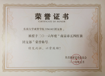 榮譽(yù)證書 共青團(tuán)南京市委員會(huì)于“五四”前開展了2016年度南京市先進(jìn)團(tuán)組織和優(yōu)秀團(tuán)員、團(tuán)干部評(píng)選表彰工作。我校336142團(tuán)支部被表彰為2016年度“南京市五四紅旗團(tuán)支部”。