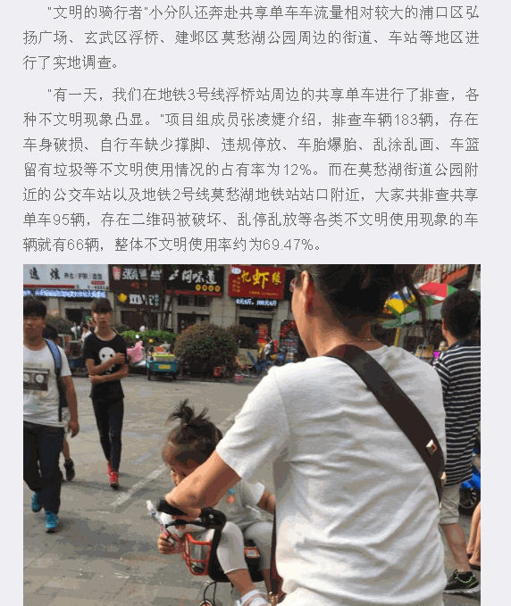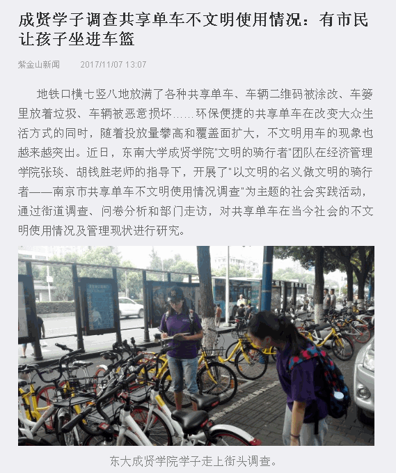 【紫金山】成賢學子調(diào)查共享單車不文明使用情況:有市民讓孩子坐進車籃