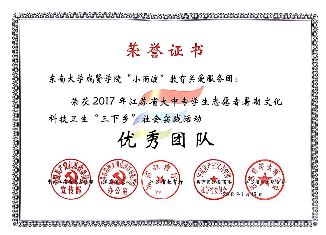 榮譽證書近日,由中共江蘇省委宣傳部、江蘇省文明辦、江蘇省教育廳、共青團江蘇省委和江蘇省學生聯(lián)合會聯(lián)合主辦的全省大中專學生志愿者暑期文化科技衛(wèi)生“三下鄉(xiāng)”社會實踐活動評比已經(jīng)落下帷幕。我校團委志工部“小雨滴”教育關(guān)愛服務(wù)團獲評2017年江蘇省暑期“三下鄉(xiāng)”社會實踐活動“優(yōu)秀團隊”。此外,校團委馮杭州老師被評為2017 年江蘇省暑期“三下鄉(xiāng)”社會實踐活動“先進工作者”。