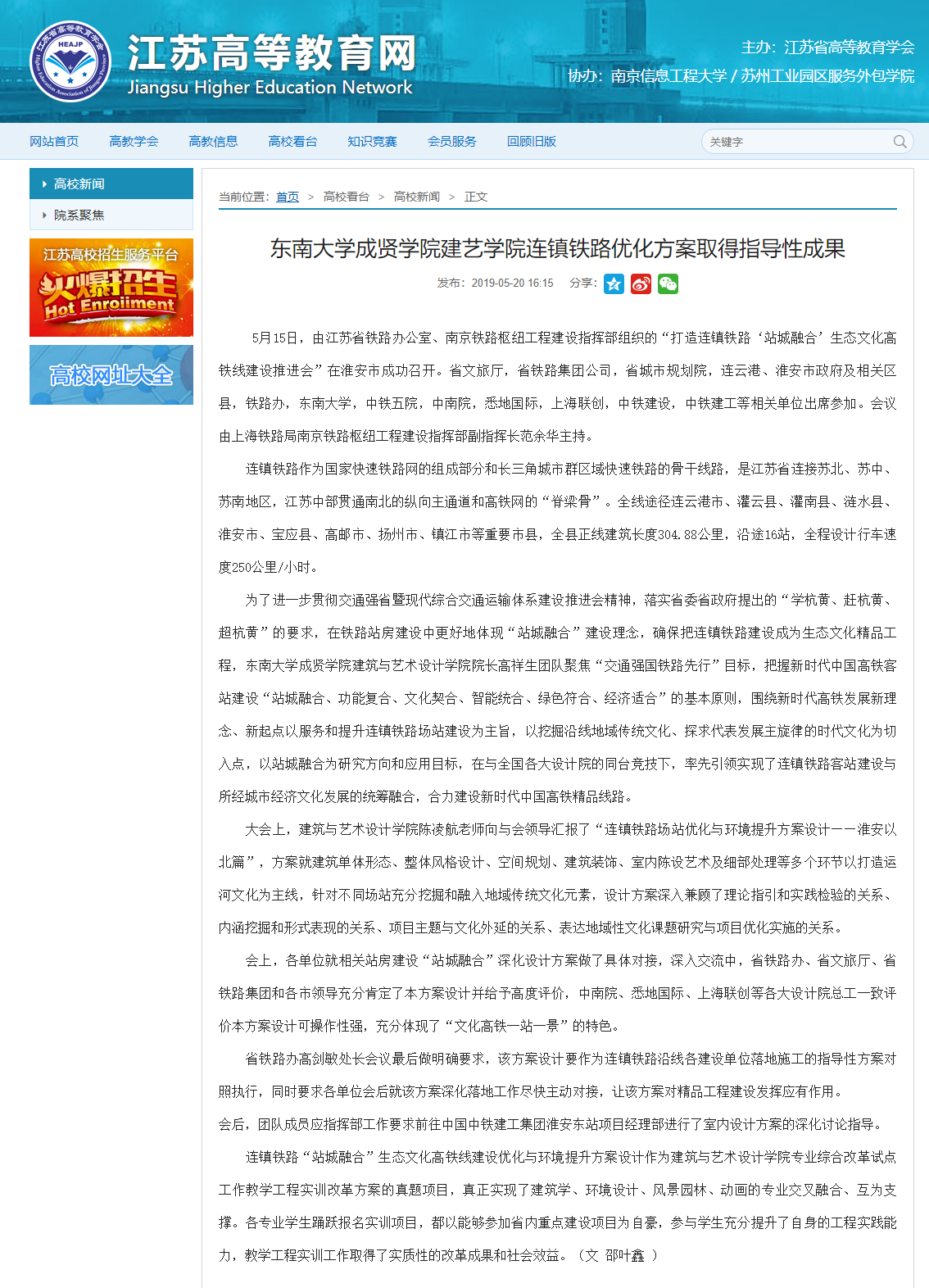 【江蘇高等教育網(wǎng)】東南大學成賢學院建藝學院連鎮(zhèn)鐵路優(yōu)化方案取得指導性成果
