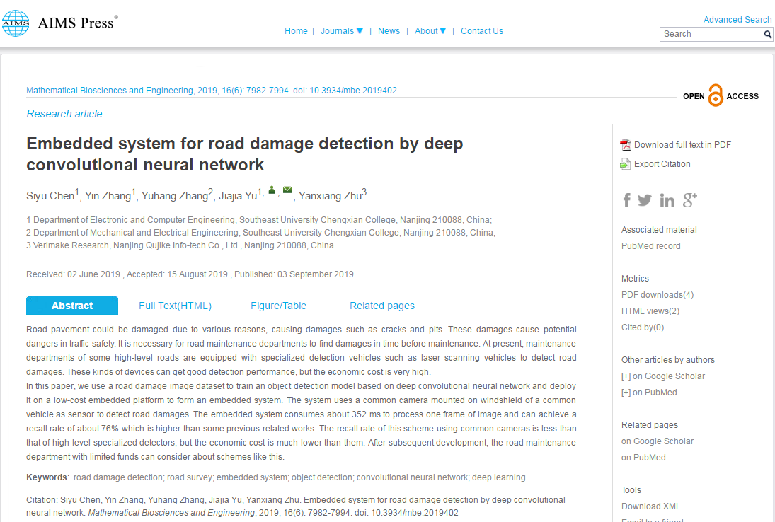 日前,電子與計(jì)算機(jī)工程學(xué)院學(xué)生科研成果喜獲突破,論文《Embedded system for road damage detection by deep convolutional neural network》已在SCI國際學(xué)術(shù)刊物《Mathematical Biosciences and Engineering》上發(fā)表,2016級(jí)電子信息工程專業(yè)陳司宇同學(xué)為該論文第一作者(指導(dǎo)教師:郁佳佳、朱燕翔),2016級(jí)電子信息工程專業(yè)章寅同學(xué)和2016級(jí)電氣工程及其自動(dòng)化章宇航同學(xué)分別為第二、三作者。