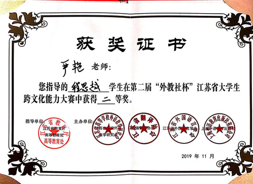 11月20日,第二屆“外教社杯”江蘇省大學生跨文化能力在揚州大學成功舉行,來自江蘇省各大本科及高職院校的在讀學生,留學生及指導老師和評委共計約150人與會。東南大學成賢學院首次組織學生參賽,經(jīng)過激烈的角逐,2017級會計1班的程思越同學榮獲二等獎,展示了良好的英語語言能力和跨文化交際能力。
