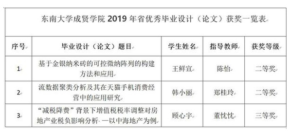 日前,江蘇省教育廳對2019年江蘇省普通高校本專科優(yōu)秀畢業(yè)設(shè)計(論文)評選結(jié)果進(jìn)行了公示。東南大學(xué)成賢學(xué)院共獲得3個獎項,其中二等獎2項、三等獎1項。