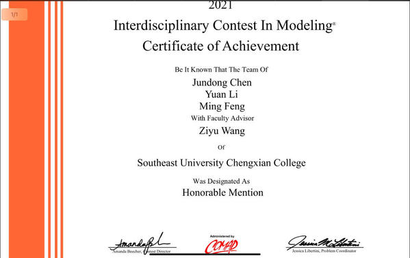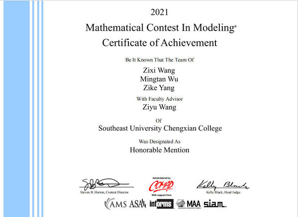 近日,2021年美國大學(xué)生數(shù)學(xué)建模競賽(MCM/ICM)評審結(jié)果正式公布。東南大學(xué)成賢學(xué)院在本屆競賽中獲得了兩項國際二等獎(Honorable Mention),打破了以往的獲獎記錄。