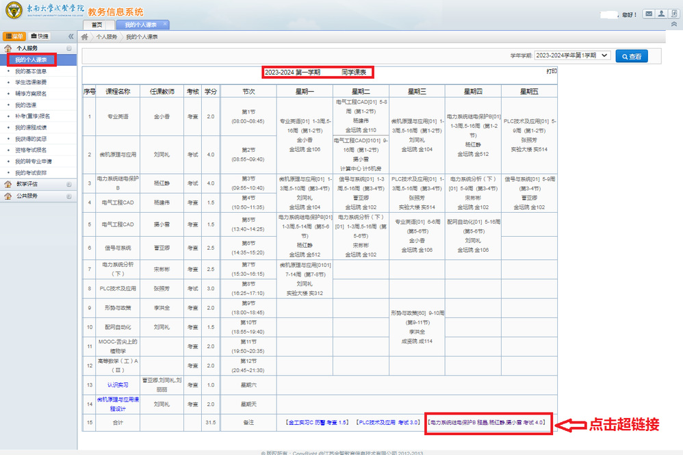 2023-2024-1學(xué)期2023級(jí)新生課表已編排好,請(qǐng)同學(xué)們及時(shí)登錄學(xué)校教務(wù)系統(tǒng)查詢個(gè)人課表并按照課表準(zhǔn)時(shí)上課。學(xué)生個(gè)人課表查詢步驟如下: