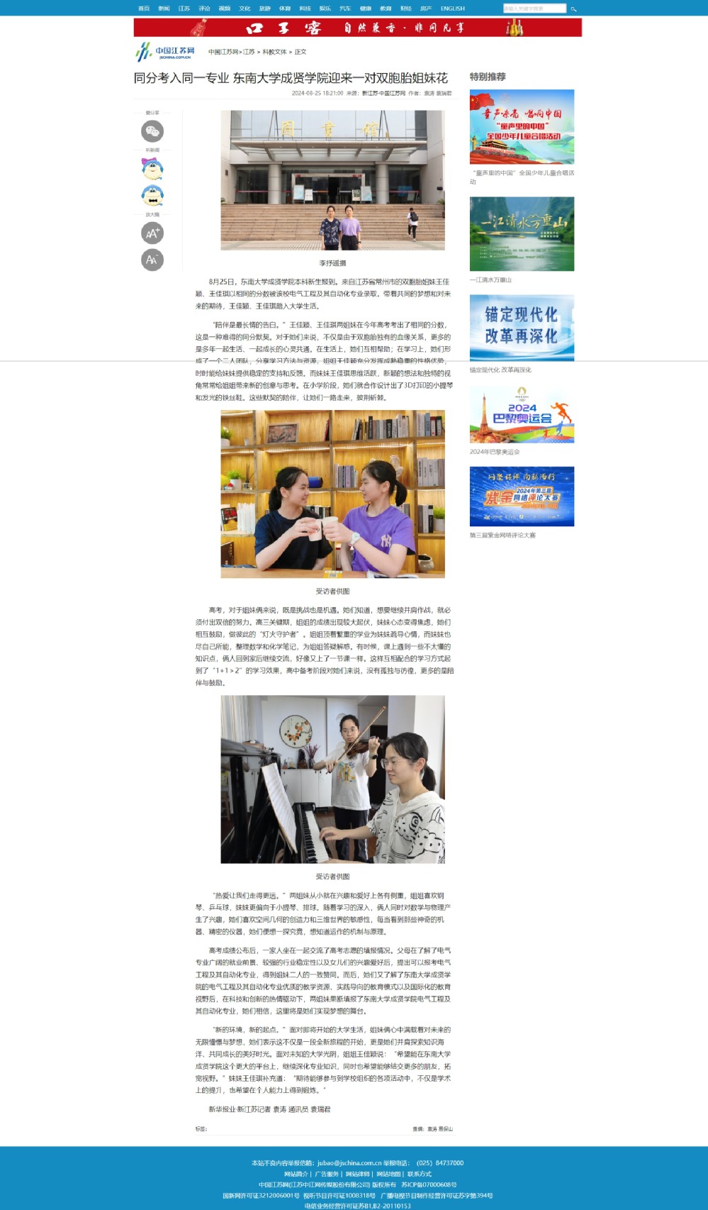 【中國江蘇網(wǎng)】同分考入同一專業(yè) 東南大學成賢學院迎來一對雙胞胎姐妹花