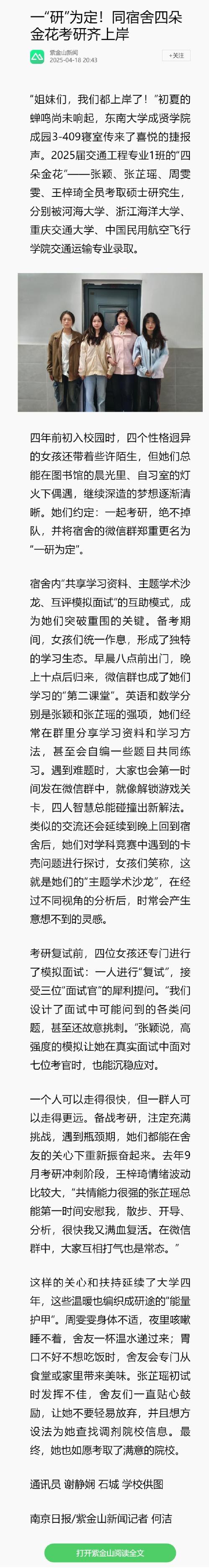 【南京日報(bào) 紫金山新聞】一“研”為定!同宿舍四朵金花考研齊上岸