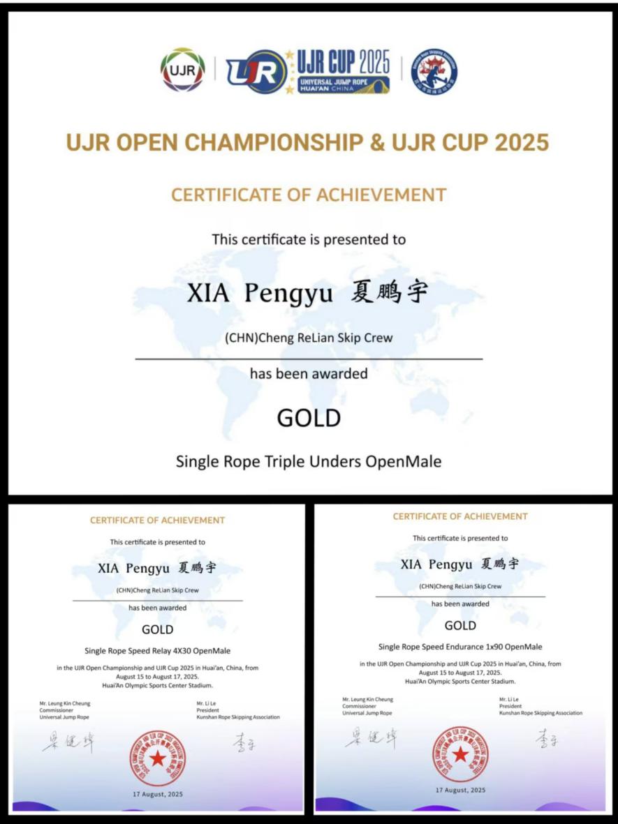 8月23日,世界跳繩公開賽(UJR)在江蘇淮安奧體中心落下帷幕。我校2023級學子夏鵬宇代表國家隊出征,在強手如林的賽場上,勇奪“4*30秒單搖”、“連續(xù)三搖跳”、“90秒單搖”三個項目的金牌。