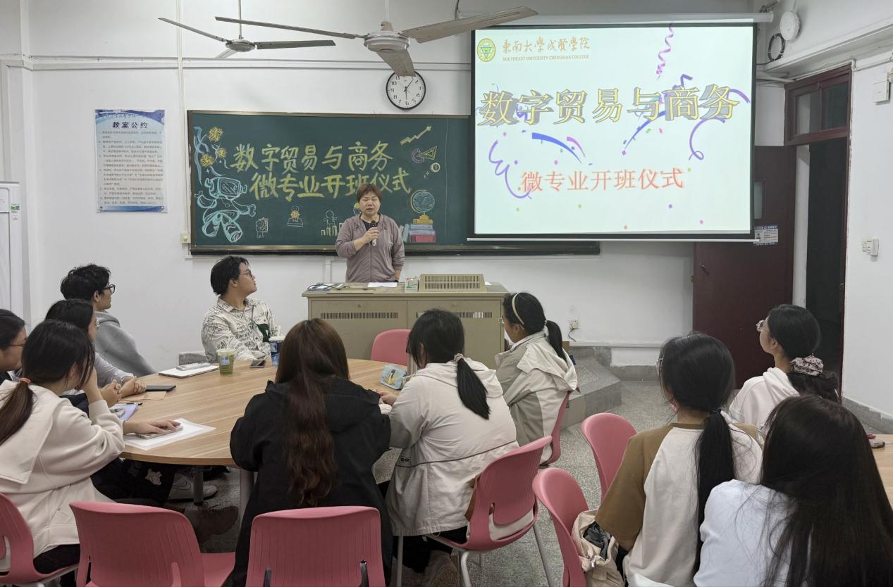 10月16日晚上,經(jīng)濟(jì)管理學(xué)院舉行首屆“數(shù)字貿(mào)易與商務(wù)”微專業(yè)開班儀式。經(jīng)濟(jì)管理學(xué)院院長戚嘯艷、副院長高凱麗、微專業(yè)負(fù)責(zé)人東南大學(xué)博導(dǎo)馮偉教授出席,同時(shí)特邀合作企業(yè)新道科技股份有限公司江南區(qū)總經(jīng)理任子宜蒞臨,與首屆微專業(yè)全體學(xué)員共同見證這一重要時(shí)刻。開班儀式由國際經(jīng)濟(jì)與貿(mào)易教研室主任戴竹青主持。