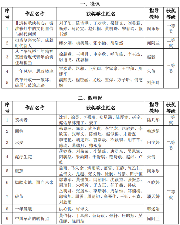 經(jīng)評(píng)審,大賽共評(píng)選出14項(xiàng)獲獎(jiǎng)作品。微電影類別中,《筑橋者》等9部作品分獲一、二、三等獎(jiǎng),其中一等獎(jiǎng)1項(xiàng)、二等獎(jiǎng)3項(xiàng)、三等獎(jiǎng)5項(xiàng);微課類別中,《非遺傳承映初心:秦淮彩燈中的文化自信與時(shí)代創(chuàng)新》等5部作品獲獎(jiǎng),包括一等獎(jiǎng)1項(xiàng)、二等獎(jiǎng)1項(xiàng)、三等獎(jiǎng)3項(xiàng)。