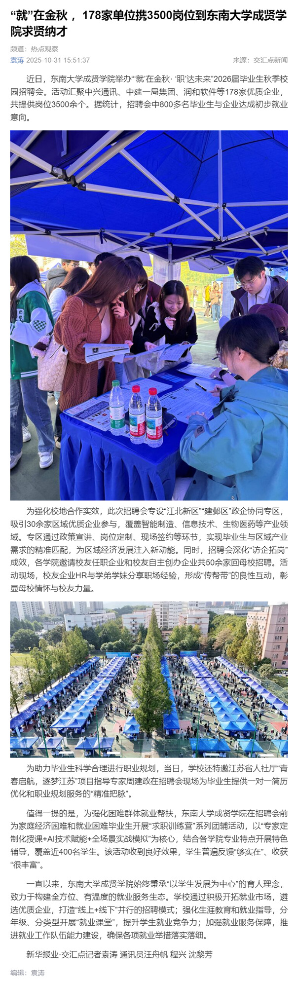 【交匯點(diǎn)新聞】“就”在金秋,178家單位攜3500崗位到東南大學(xué)成賢學(xué)院求賢納才