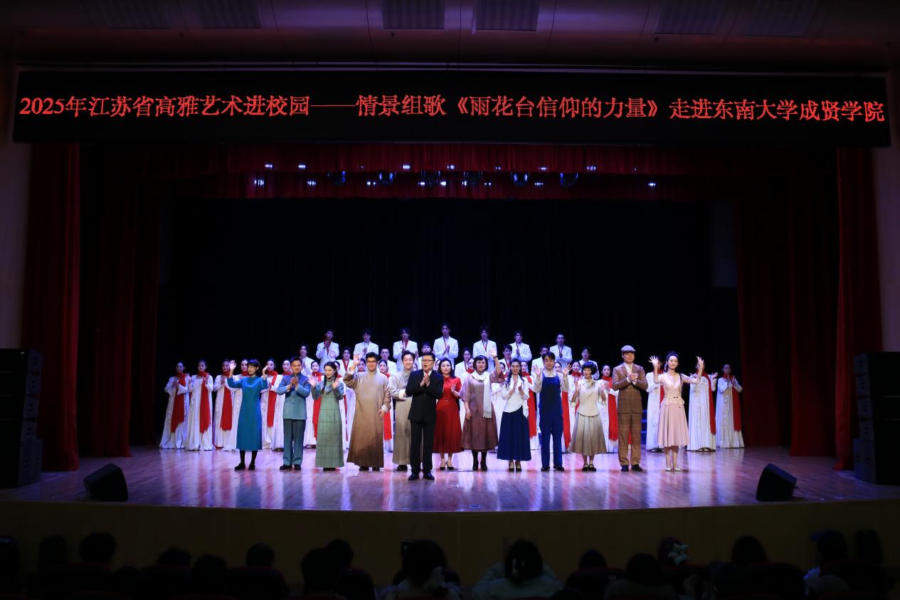 為弘揚(yáng)紅色文化,以美育浸潤(rùn)校園,11月6日晚,由校團(tuán)委主辦、大學(xué)生藝術(shù)指導(dǎo)中心承辦的2025江蘇省高雅藝術(shù)進(jìn)校園——南京市歌舞劇院攜情景組歌《雨花臺(tái)信仰的力量》在綜合樓313報(bào)告廳上演。以藝術(shù)為媒介,為全校650名師生呈現(xiàn)了一堂生動(dòng)而深刻的“思政美育課”。