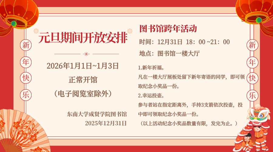 2026年1月1日~1月3日,正常開館。(電子閱覽室除外)期末臨近,元旦期間圖書館堅持開館為讀者服務,請同學們自覺遵守規(guī)章制度,配合管理,珍惜把握好圖書館空間和資源。圖書館將繼續(xù)竭誠為您服務!祝同學們元旦快樂!