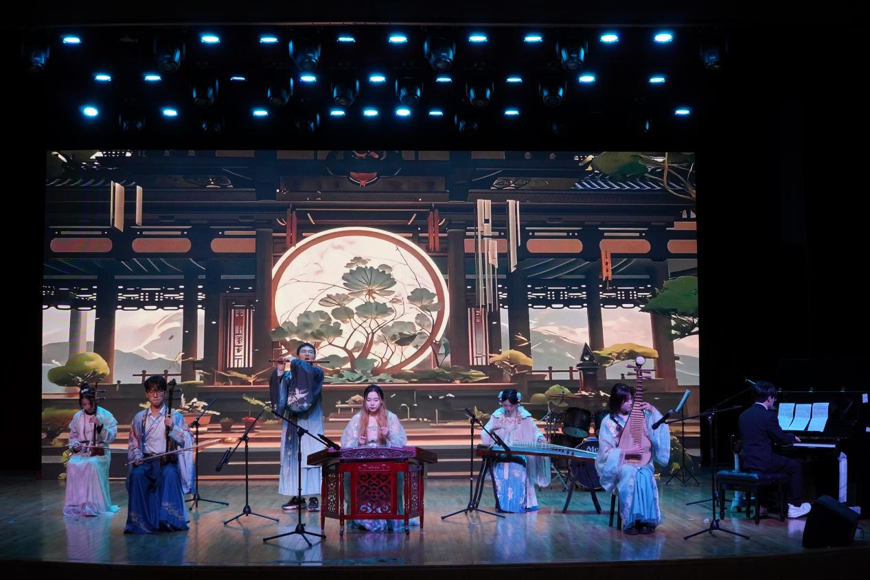 演出在悠揚的旋律中徐徐展開,一曲《蘭亭序》拉開序幕,婉轉曲調勾勒出傳世名篇的雅致意境;古箏重奏《山居秋暝》《戰(zhàn)臺風》接連登場,前者以清雅之音描摹秋日山林的靜謐悠然,后者憑激昂旋律彰顯風雨來襲的磅礴氣勢;琵琶獨奏《十面埋伏》節(jié)奏急促、鏗鏘有力,將古戰(zhàn)場的緊張氛圍與激烈交鋒刻畫得入木三分;竹笛與鋼琴合奏的《美麗的神話》,讓民族樂器的悠揚與西洋樂器的醇厚完美交融,訴說著跨越時空的動人情愫;吉他彈奏《All Falls Down》節(jié)奏明快,盡顯青春朝氣;小提琴演繹《第二圓舞曲》旋律流暢,帶領觀眾沉浸在典雅浪漫的音樂世界;竹笛合奏《那些年》喚起全場師生的青春記憶,以熟悉的曲調引發(fā)陣陣共鳴;《Fly Me to the Moon》以靈動音符勾勒月夜夢幻,《萬疆》以恢宏旋律禮贊祖國山河;鋼琴獨奏《第一鋼琴協(xié)奏曲第二樂章》盡顯古典雋永,《Walking by the World》融合東方韻律與西方和聲,為這場冬日音樂雅會畫上圓滿句號。