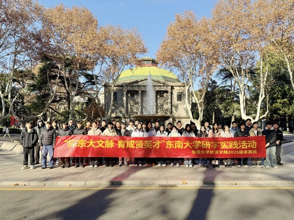 12月26日,我院2025級求真班在學(xué)生處處長施杰、求真班輔導(dǎo)員王文平的帶領(lǐng)下踏入了承載著百廿年輝煌的東南大學(xué)四牌樓校區(qū),開展了一場主題為“探東大文脈,育成賢英才”的研學(xué)實踐活動。同學(xué)們循著歷史的脈絡(luò),在校史館的厚重、梅庵的靜謐、大禮堂的莊嚴(yán)與六朝松的蒼勁之間,整體感悟東南大學(xué)跨越世紀(jì)的“文脈”真諦與“英才”育成之道。
