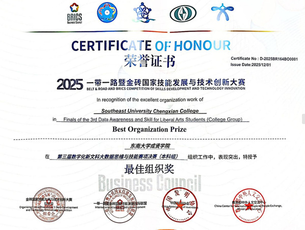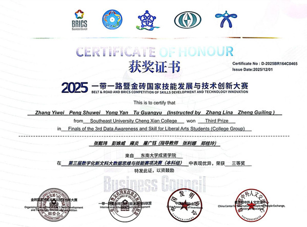 在剛剛落幕的2025年“一帶一路”暨金磚國家技能發(fā)展與技術(shù)創(chuàng)新大賽 數(shù)字化新文科大數(shù)據(jù)思維與技能賽項(xiàng)中,我校經(jīng)濟(jì)管理學(xué)院師生表現(xiàn)卓越,在指導(dǎo)老師張利娜、鄭桂玲和李偉老師的指導(dǎo)下,何漫、張清奕、許嫻敏、黃淑萌四位同學(xué)斬獲國家一等獎(jiǎng),張懿瑋、彭姝威、雍炎、屠廣鈺四位同學(xué)獲得國家三等獎(jiǎng)。我校憑借優(yōu)異成績榮獲最佳組織獎(jiǎng)。