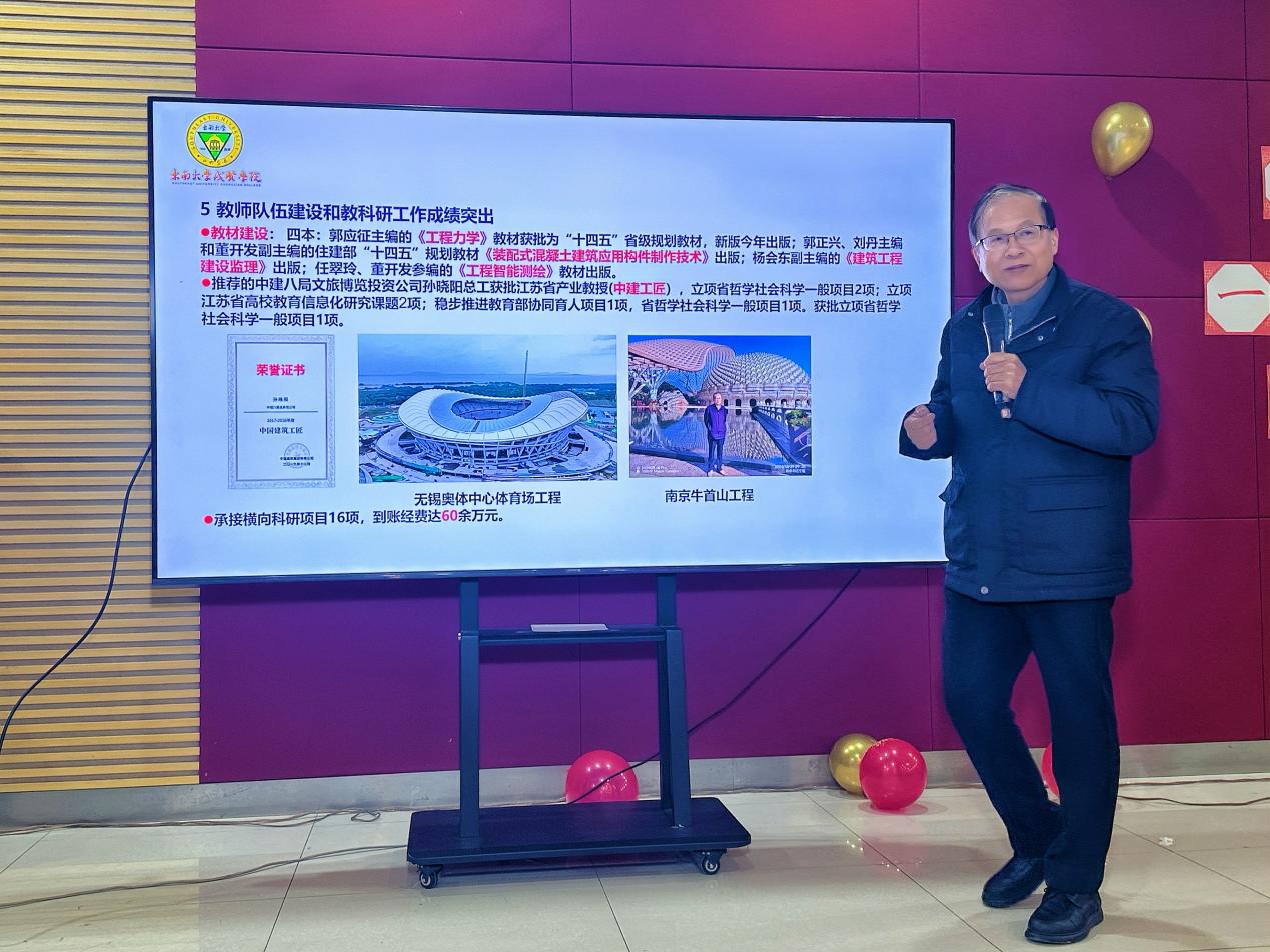 活動尾聲,郭正興院長發(fā)表總結(jié)講話。他代表學(xué)院領(lǐng)導(dǎo)班子向全體教職工致以誠摯的新年祝福,對大家一年來的辛勤付出表示衷心感謝。郭院長全面復(fù)盤2025年學(xué)院發(fā)展成果,深入剖析當(dāng)前面臨的機(jī)遇與挑戰(zhàn),并結(jié)合2026年度重點(diǎn)工作計劃,號召全體教職工拿出策馬揚(yáng)鞭的勇氣、激發(fā)萬馬奔騰的活力、保持馬不停蹄的干勁,以更加飽滿的熱情、更加務(wù)實(shí)的作風(fēng),攜手并肩為學(xué)院高質(zhì)量發(fā)展不懈奮斗。